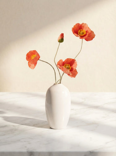 A delicate tableau of movement and color, our Petite Poppy Arrangement features a playful dance of whimsical coral, peach and champagne poppies. Perfectly sized to add an artistic whisper of nature's beauty to a small table or shelf, it embodies effortless style. Featuring 4 blooms/buds.